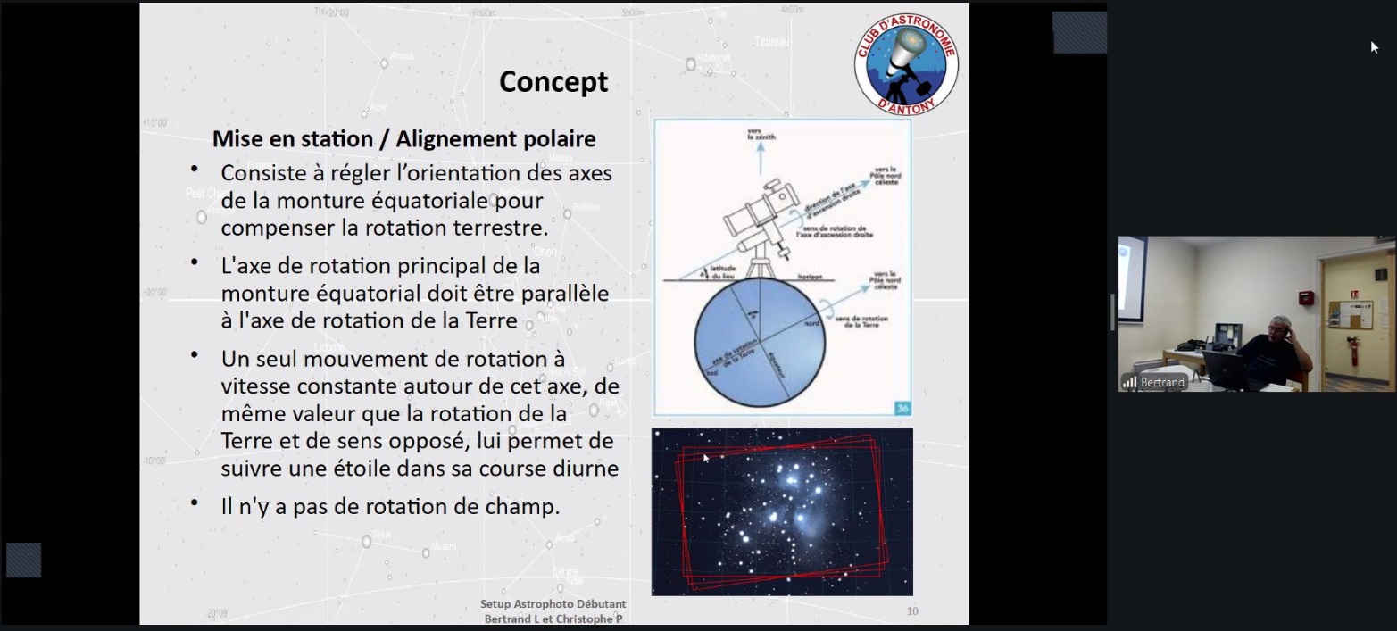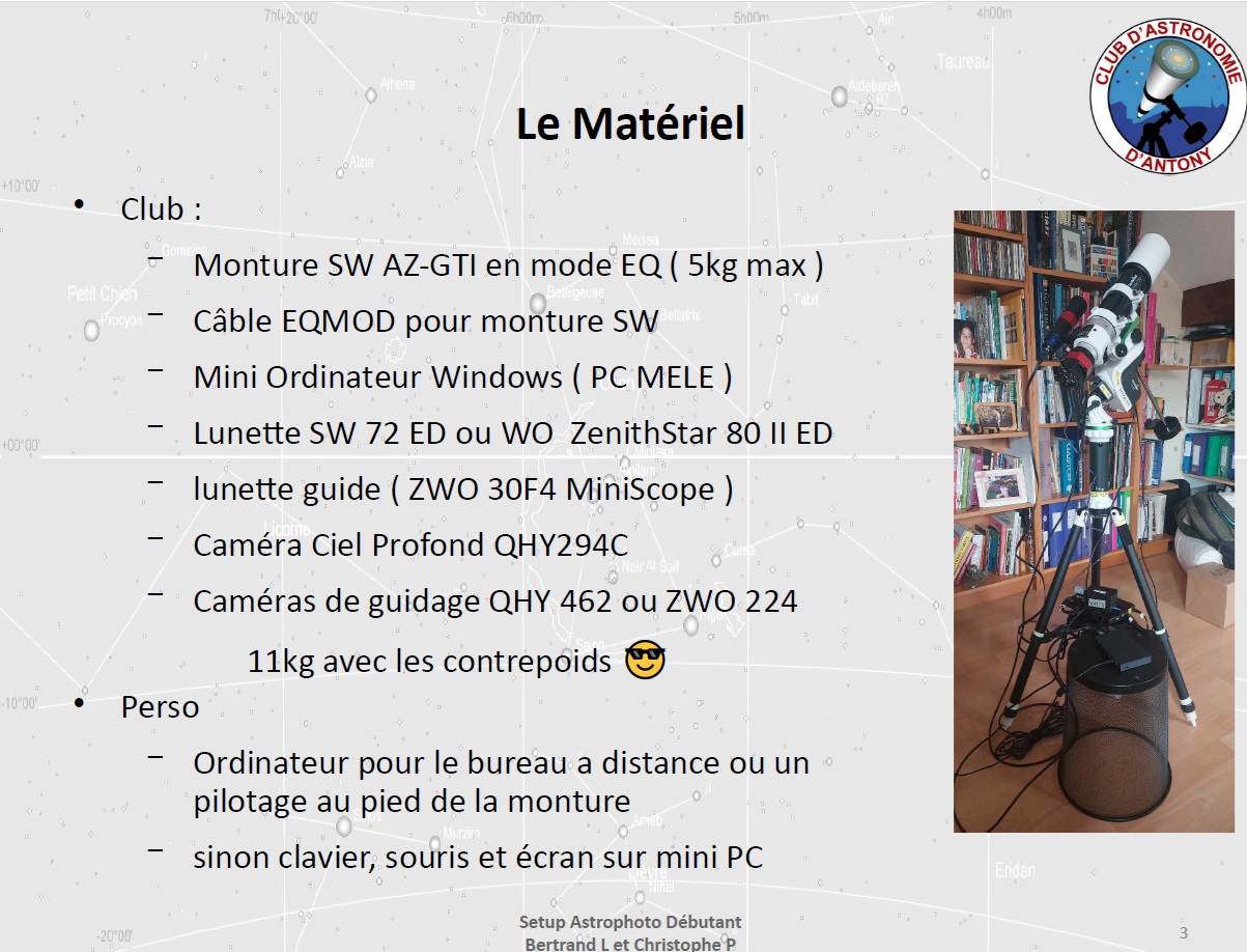 Ce soir au Club, Bertrand L et Christophe P proposent de présenter un instrument d’astronomie facilement transportable et utilisable, basé sur une monture SkyWatcher AZ-GTI et une lunette mis à la disposition des membres plus particulièrement débutants : un setup léger dédié à l’astrophotographie.