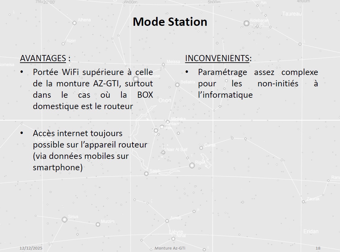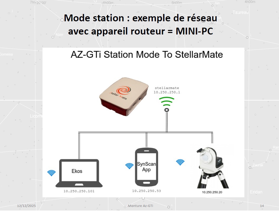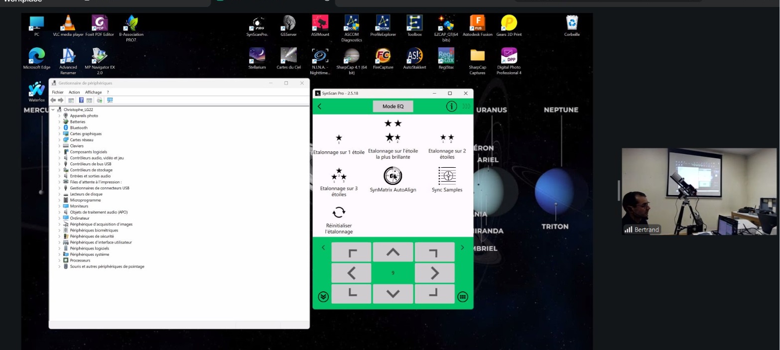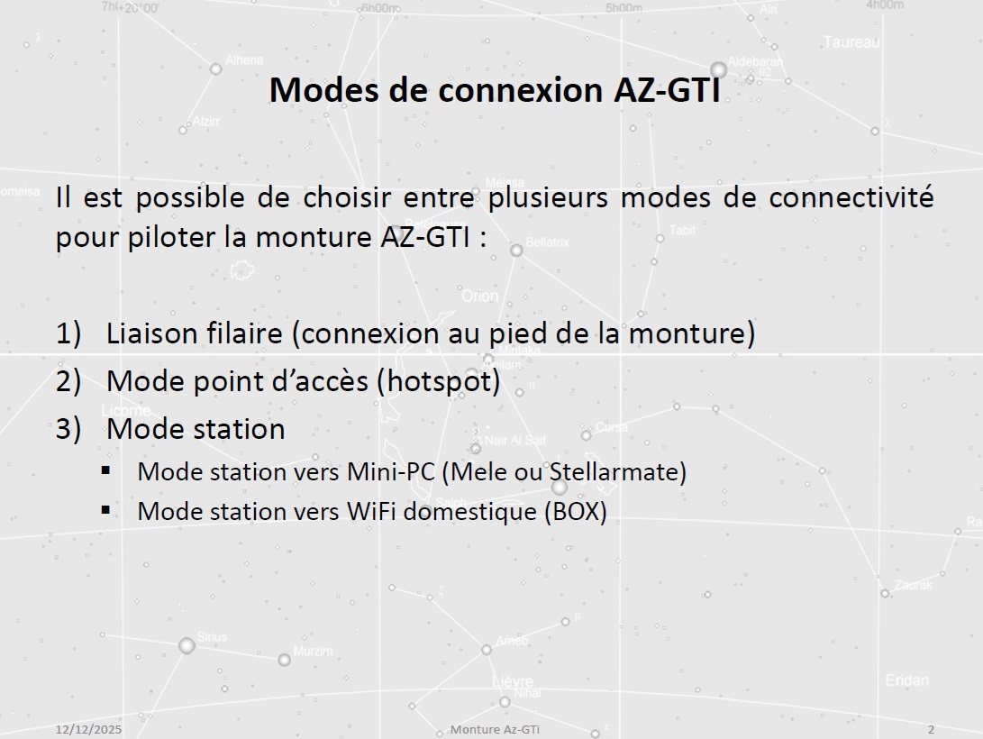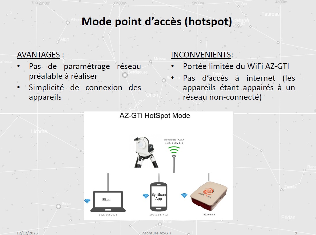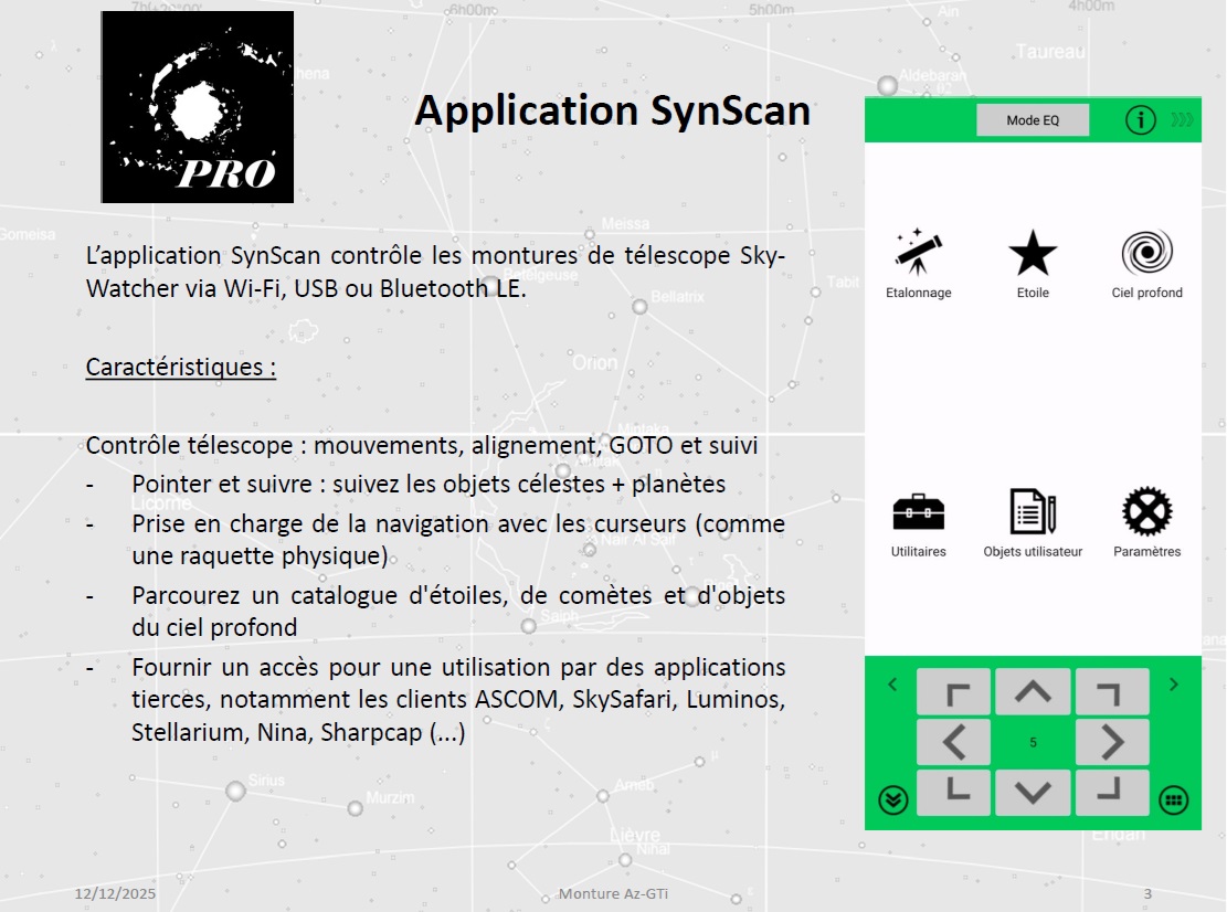 Christophe évoque les différents modes de connexion possibles pour le pilotage du setup (liaison filaire, mode point d’accès via un hotspot, mode station), ainsi que l’application SynScan assurant le contrôle de la monture.