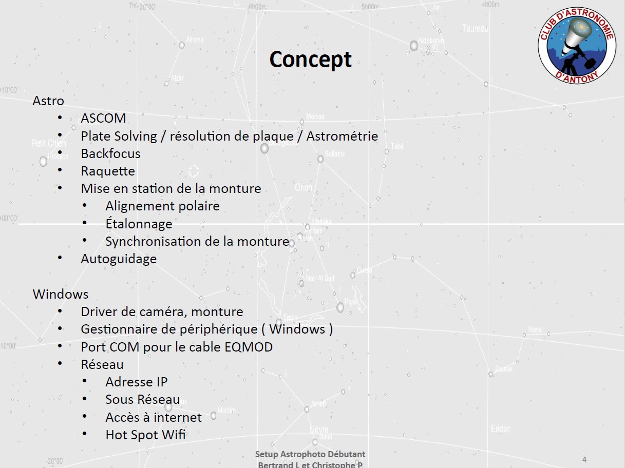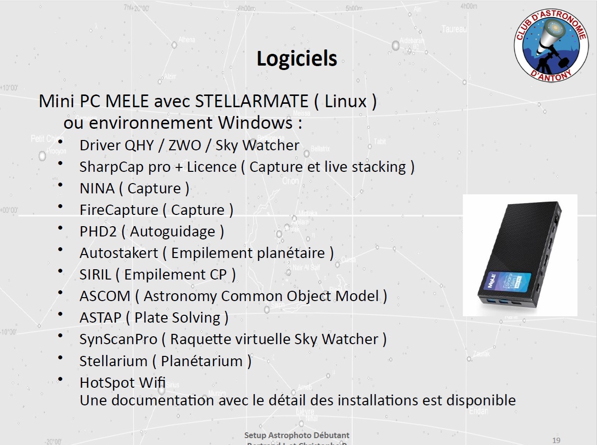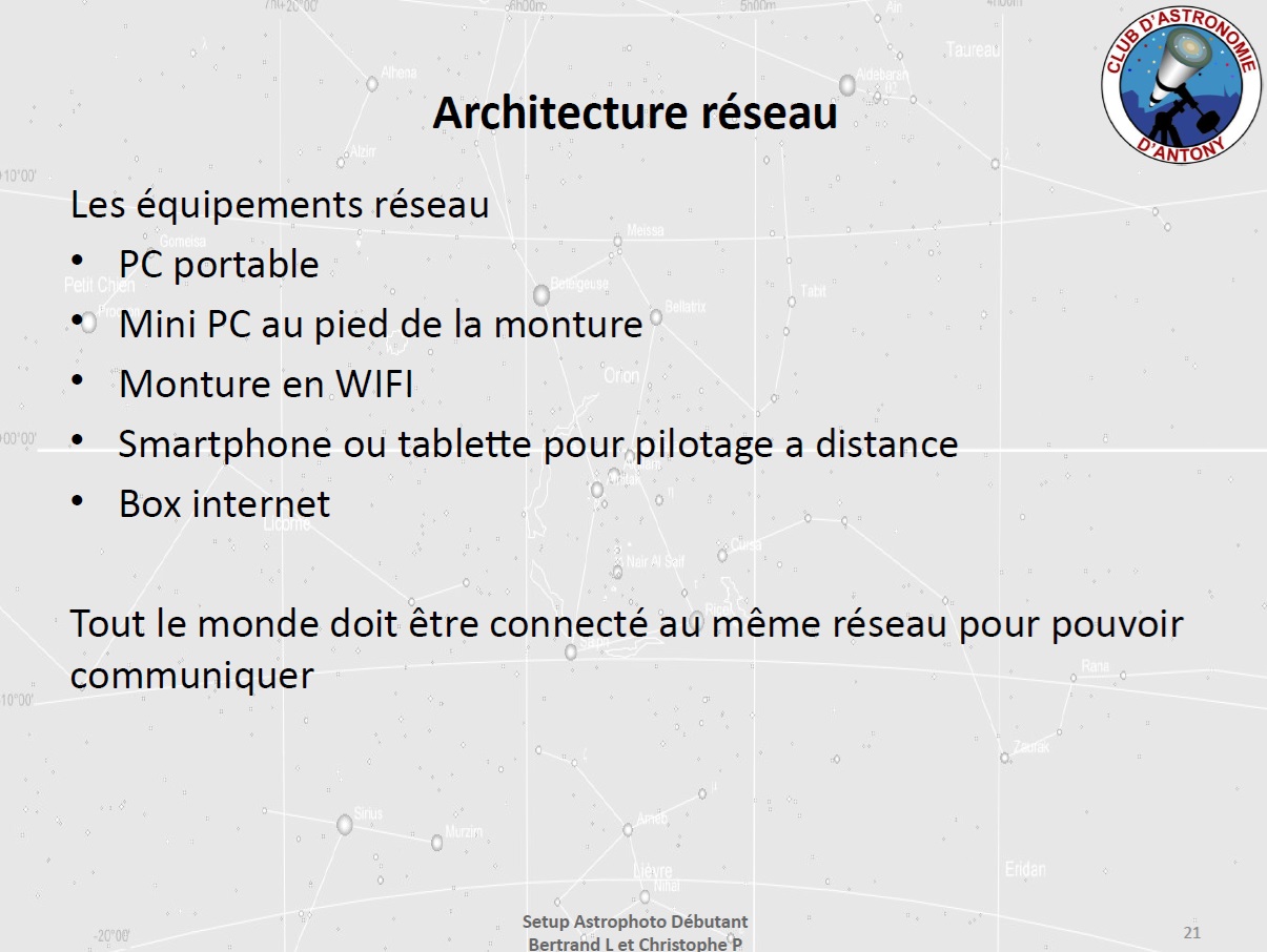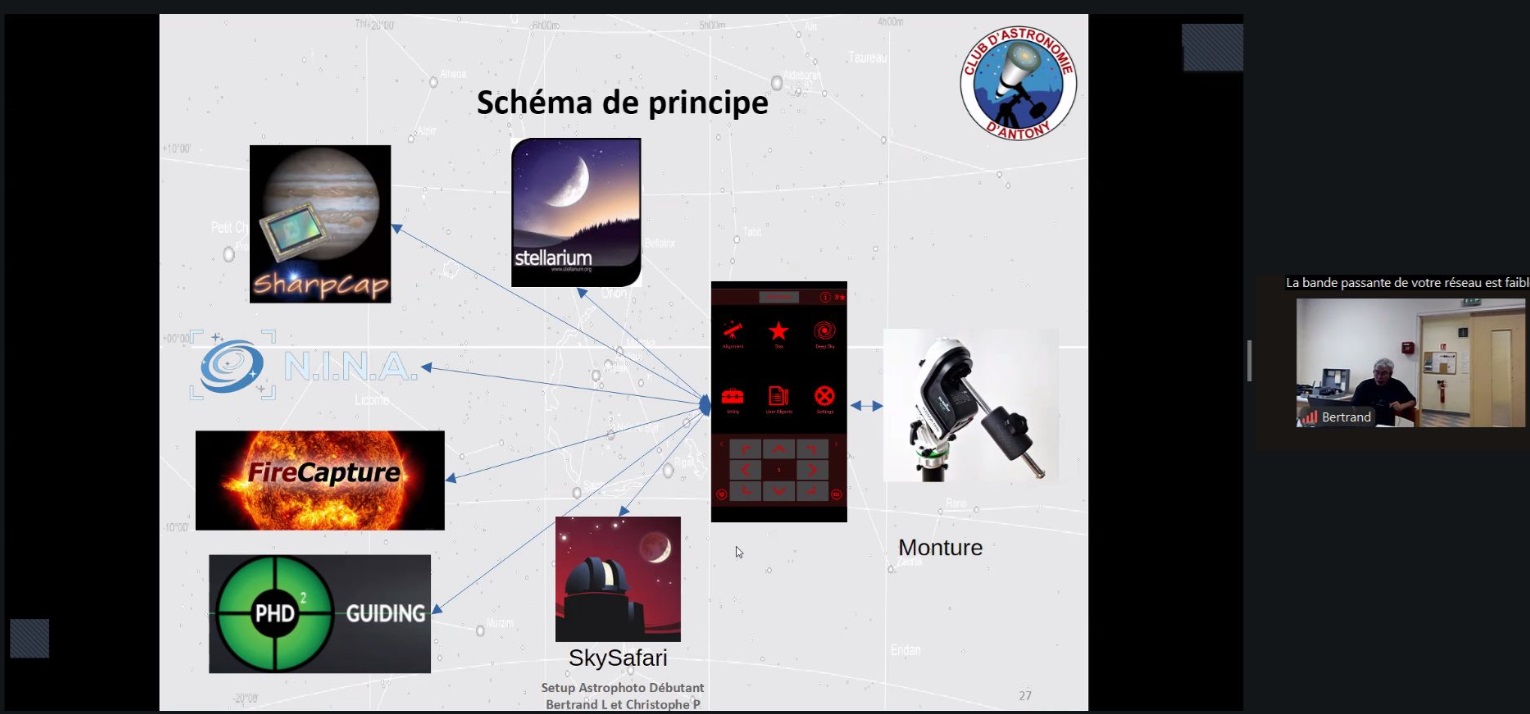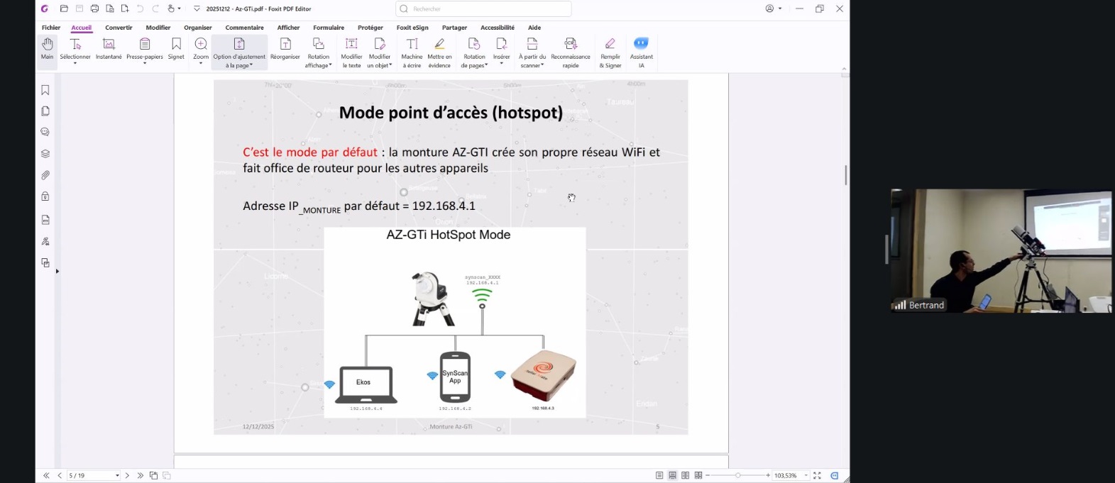 Christophe évoque les différents modes de connexion possibles pour le pilotage du setup (liaison filaire, mode point d’accès via un hotspot, mode station), ainsi que l’application SynScan assurant le contrôle de la monture.