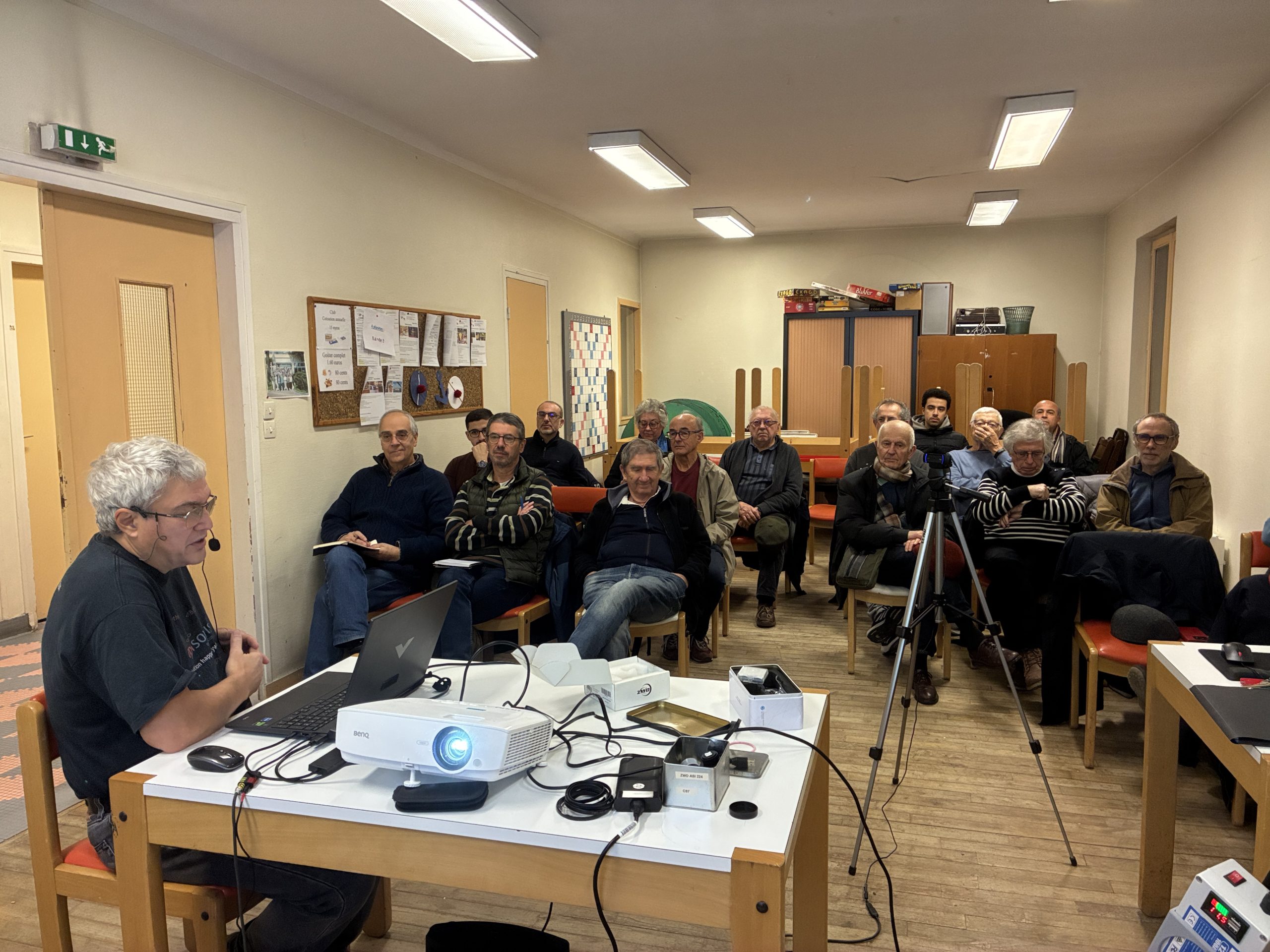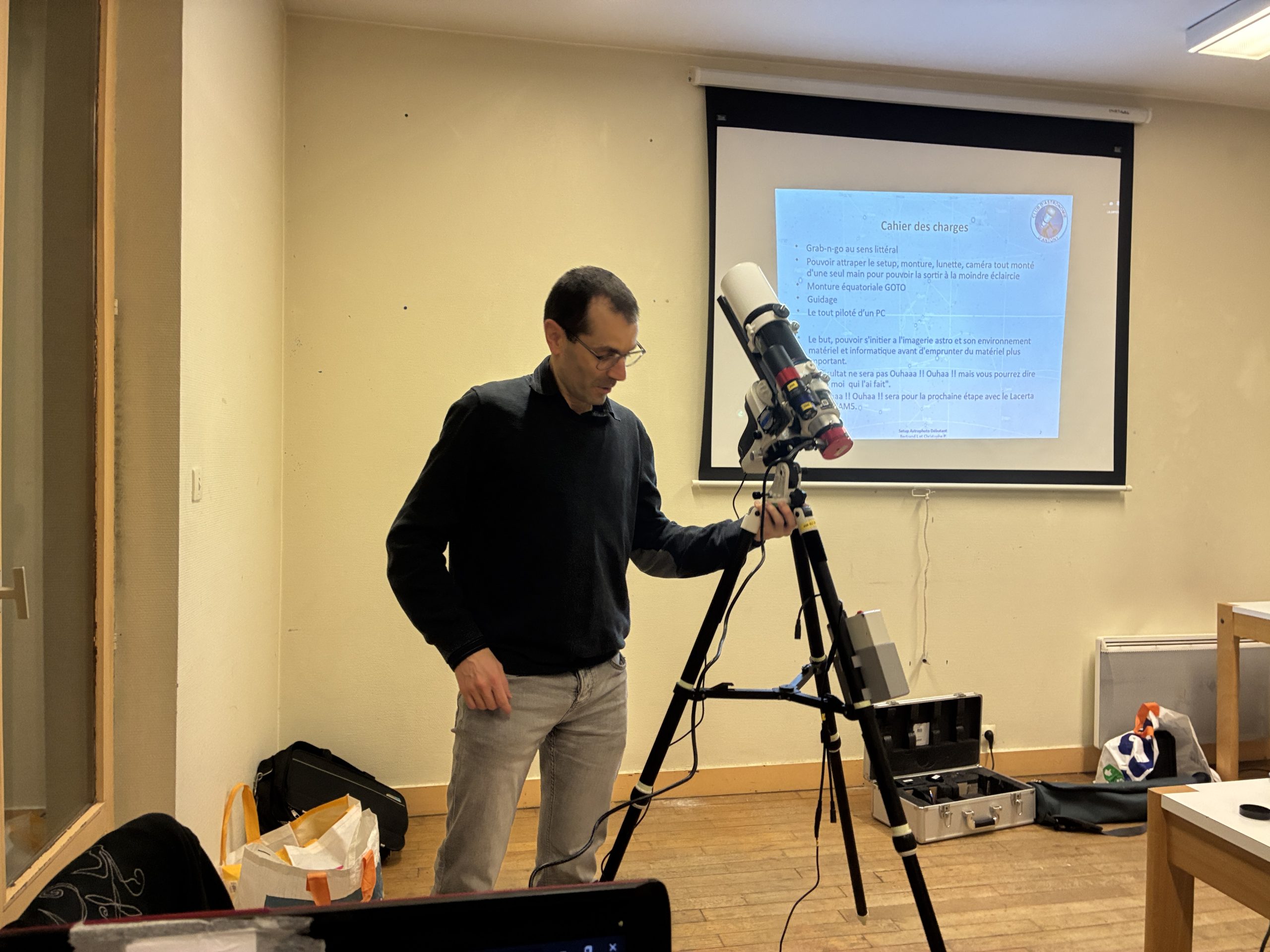 Bertrand débute la conférence devant un auditoire attentif, tandis que Christophe installe le matériel, sous l’œil très intéressé de Hervé !