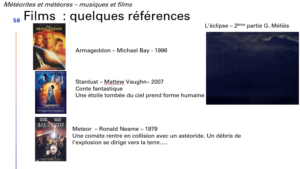 Souvent considérés comme une vision apocalyptique, les météorites peuvent également être présentées sous une forme picturale réaliste, éthérée ou contemporaine, religieuses ou, une fois encore, musicale et cinématographique.