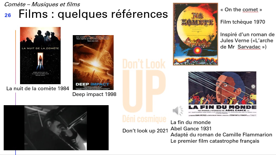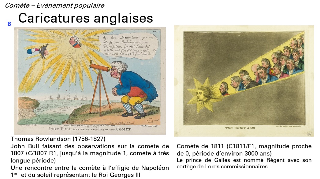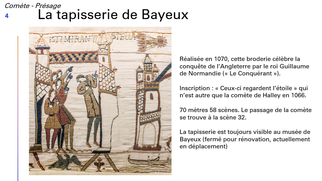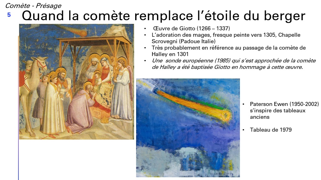 Jean-Marc débute sa conférence en retraçant l’impact des passages cométaires sur la compréhension historique et artistique : parfois présage néfaste ou signe prometteur, à la discrétion des auteurs.