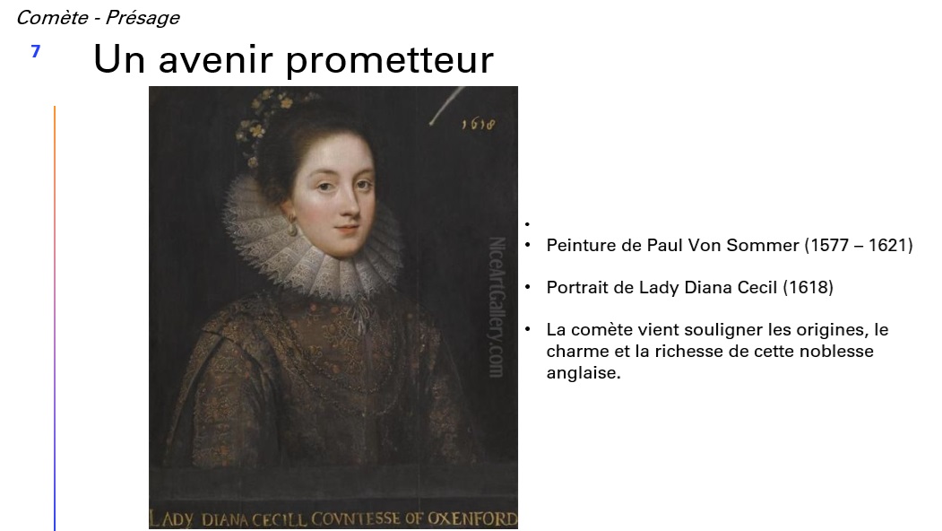 Enfin, une peinture de Paul Von Sommer (1577-1621) présentant Lady Diana Cecil (1618), accompagnée d’une comète soulignant les origines, le charme et la richesse de cette noblesse anglaise.