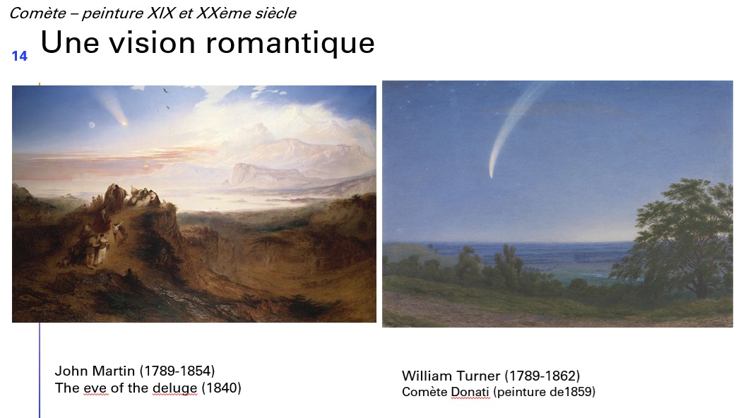 Ainsi, la tapisserie de Bayeux évoquant la comète de Halley en 1066; la fresque de Giotto L’Adoration des mages (vers 1305) mentionnant également le passage de cette comète en 1301, une gravure de Albrecht Dürer intitulée Melencoliah dont L’astre représenté serait la grande comète de l’hiver 1513-1514.