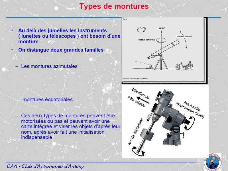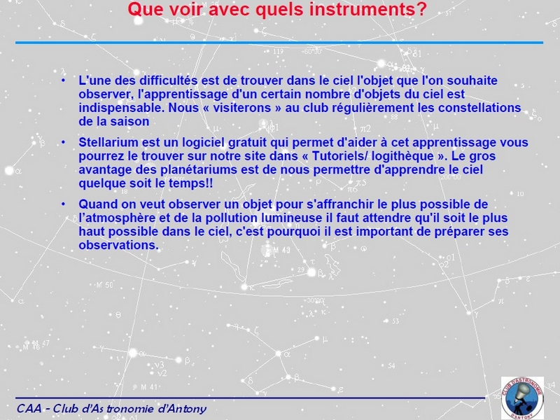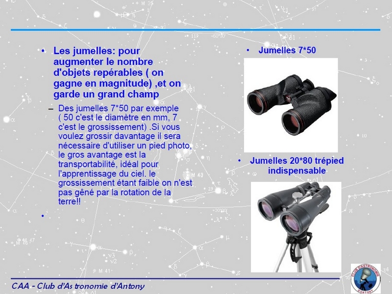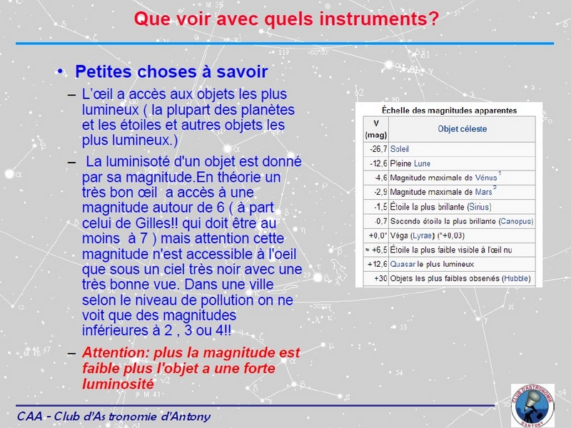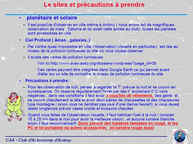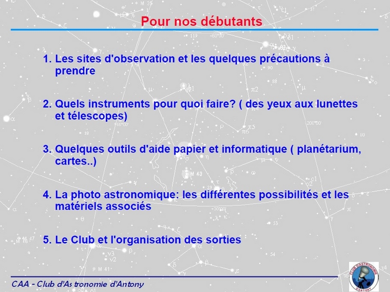 Hier soir après un peu de théorie en salle, le dobson a été sorti, et à notre très grand étonnement nous avons eu accès à de très beaux objets du ciel profond, ce qui est assez rare à Antony, ciel clair et peu de turbulence, assez bonne visibilité à l'œil nu!! plutôt meilleure que d'habitude, l'utilisation de filtres a été très efficace, nous avons pu admirer M57, M27, M31, M15, Albiréo A et B son compagnon… et quand je suis parti vers minuit quelques-uns attendaient Jupiter!! peut-être nous en diront-ils un peu plus!! @Hervé Ce qui a été interessant aussi, c'est de comparer nos propres cheminements d'étoiles en étoiles pour trouver un objet. Pour trouver M27, Jacques et Gilles partent d'Albiréo (constellation du Cygne) alors que moi je pars d'Altair (Aigle) puis les étoiles de la constellation de la Flèche. Pour trouver M31, Nicolas part des 2 étoiles de la gauche du W de la constellation de Cassiopée et moi depuis une des étoiles principales (Mirach) de la constellation d'Andromède. @ Stéphane |